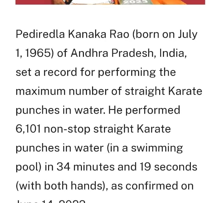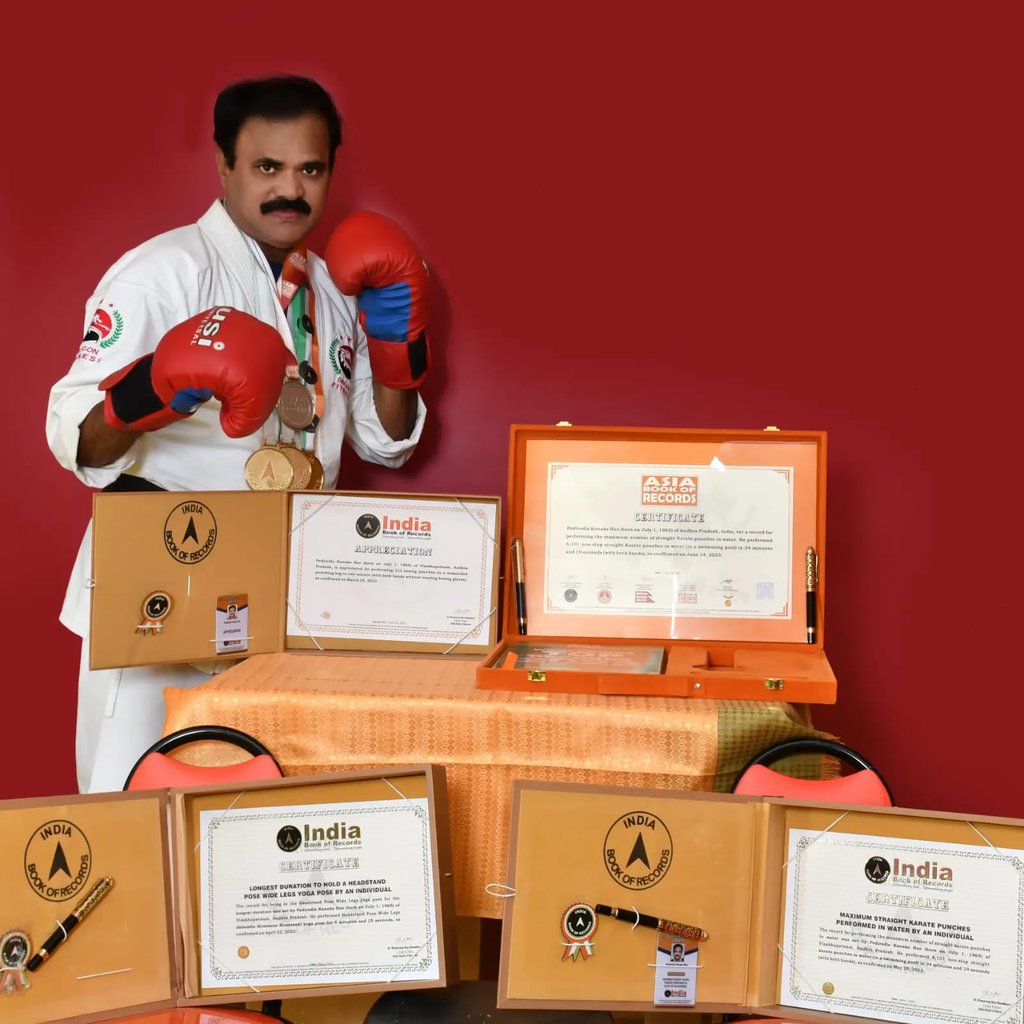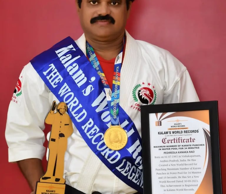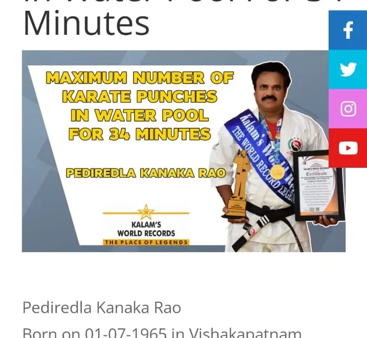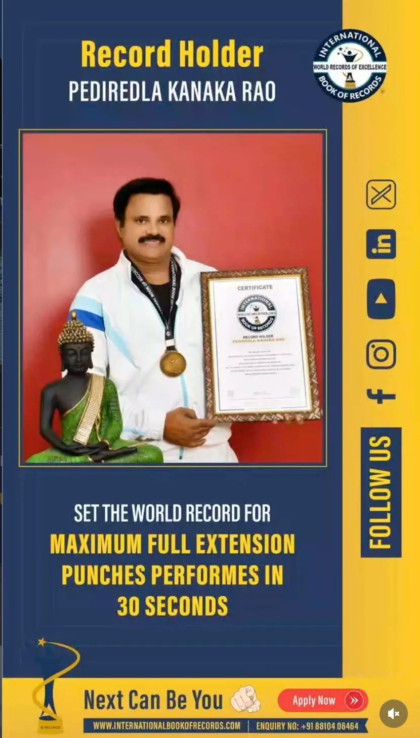 Beyond personal achievements, Pediredla Kanakarao is deeply committed to social service and youth empowerment. He regularly conducts martial arts summer camps, self-defense training programs for school girls, and yoga sessions for community organizations. Many of his students have also achieved recognition in record books, reflecting his excellence as a mentor and trainer. His lifelong mission is to inspire people to build strength, confidence, discipline, and a healthy lifestyle through martial arts and yoga.