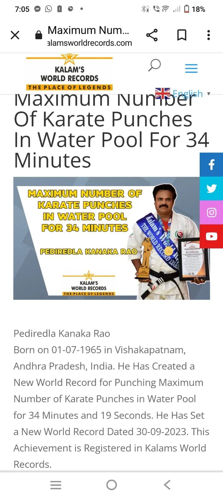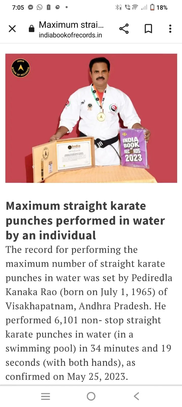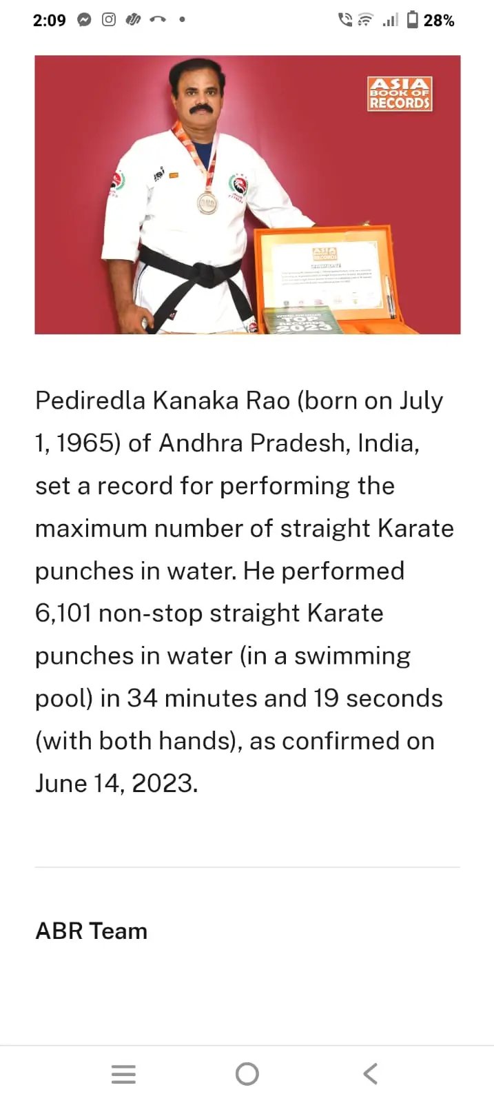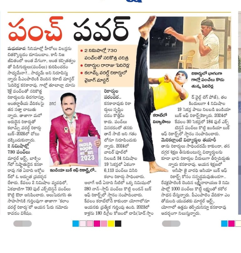 Beyond personal achievements, Pediredla Kanakarao is deeply committed to social service and youth empowerment. He regularly conducts martial arts summer camps, self-defense training programs for school girls, and yoga sessions for community organizations. Many of his students have also achieved recognition in record books, reflecting his excellence as a mentor and trainer. His lifelong mission is to inspire people to build strength, confidence, discipline, and a healthy lifestyle through martial arts and yoga.