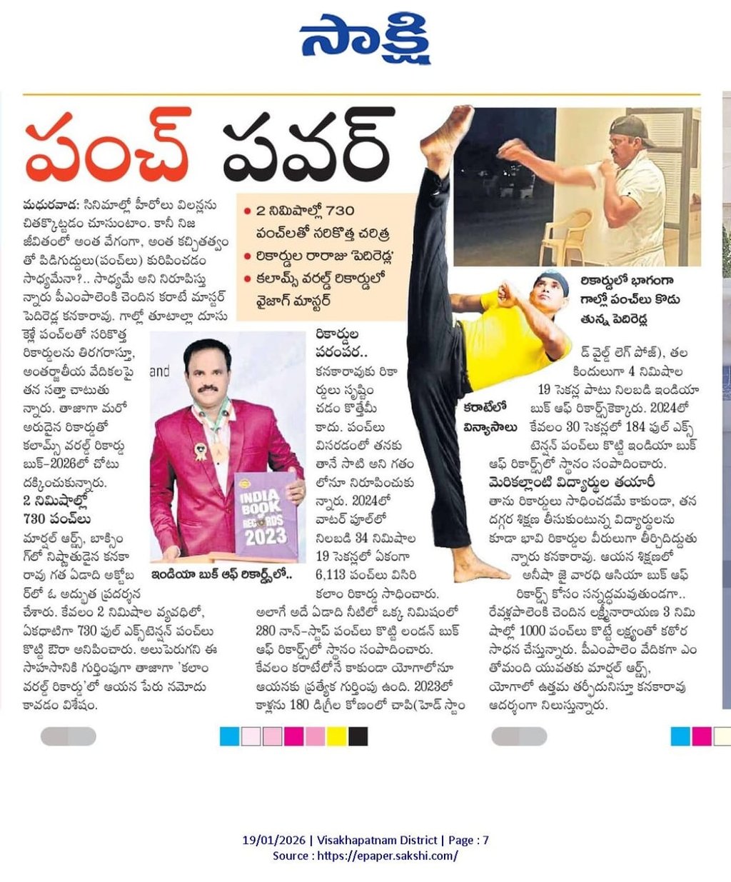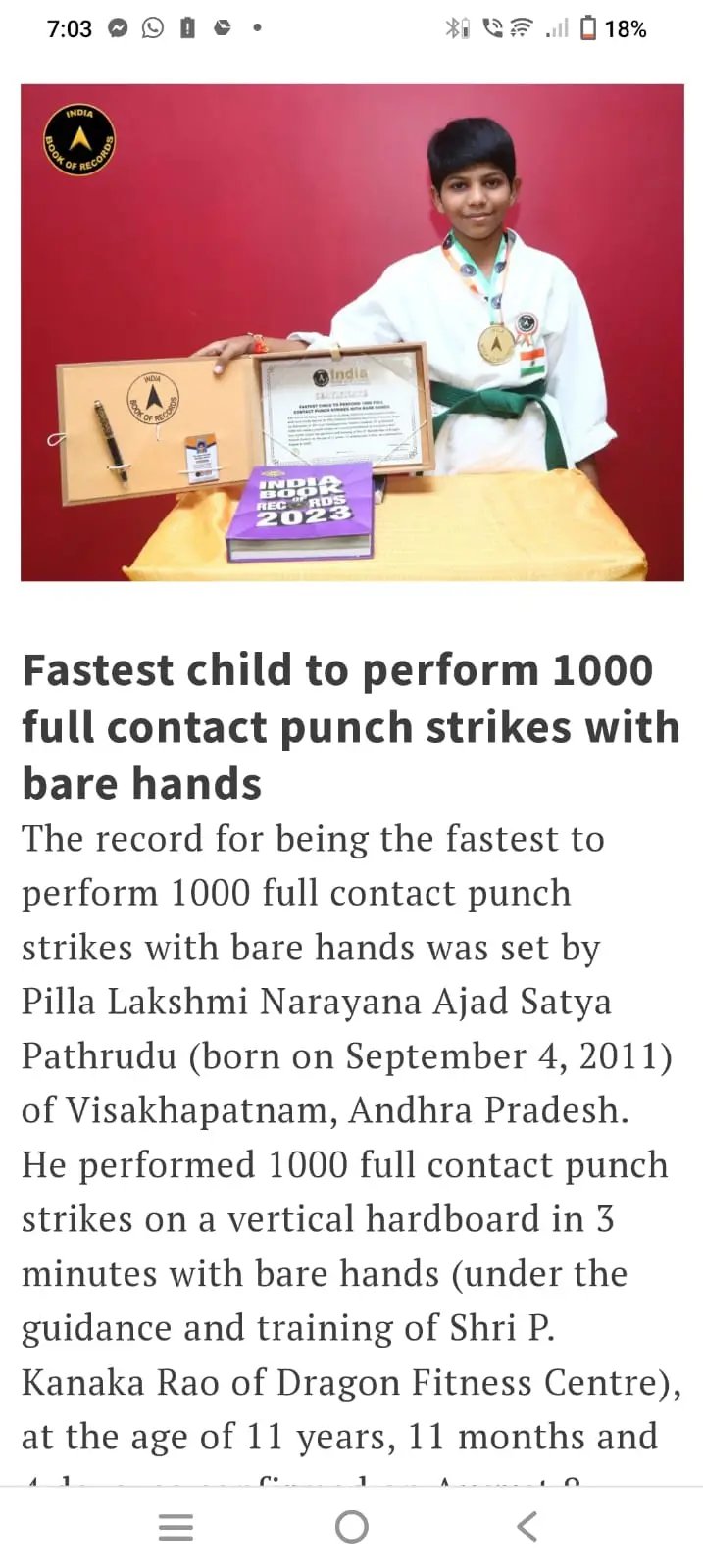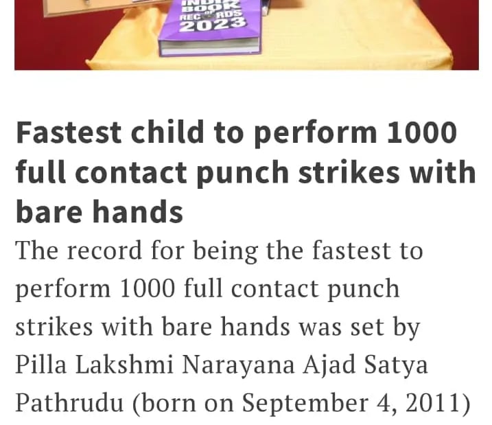 Pilla Lakshmi Narayana Ajad Satya Pathrudu from Visakhapatnam achieved an India Book of Records title for becoming the fastest child to perform 1000 full contact punch strikes with bare hands. He successfully completed 1000 punches on a vertical hardboard in just 3 minutes, demonstrating exceptional speed, strength, and discipline. This remarkable achievement was accomplished under the expert guidance and training of Shri Pediredla Kanakarao of Dragon Fitness Centre, highlighting the effectiveness of his martial arts training and mentorship.