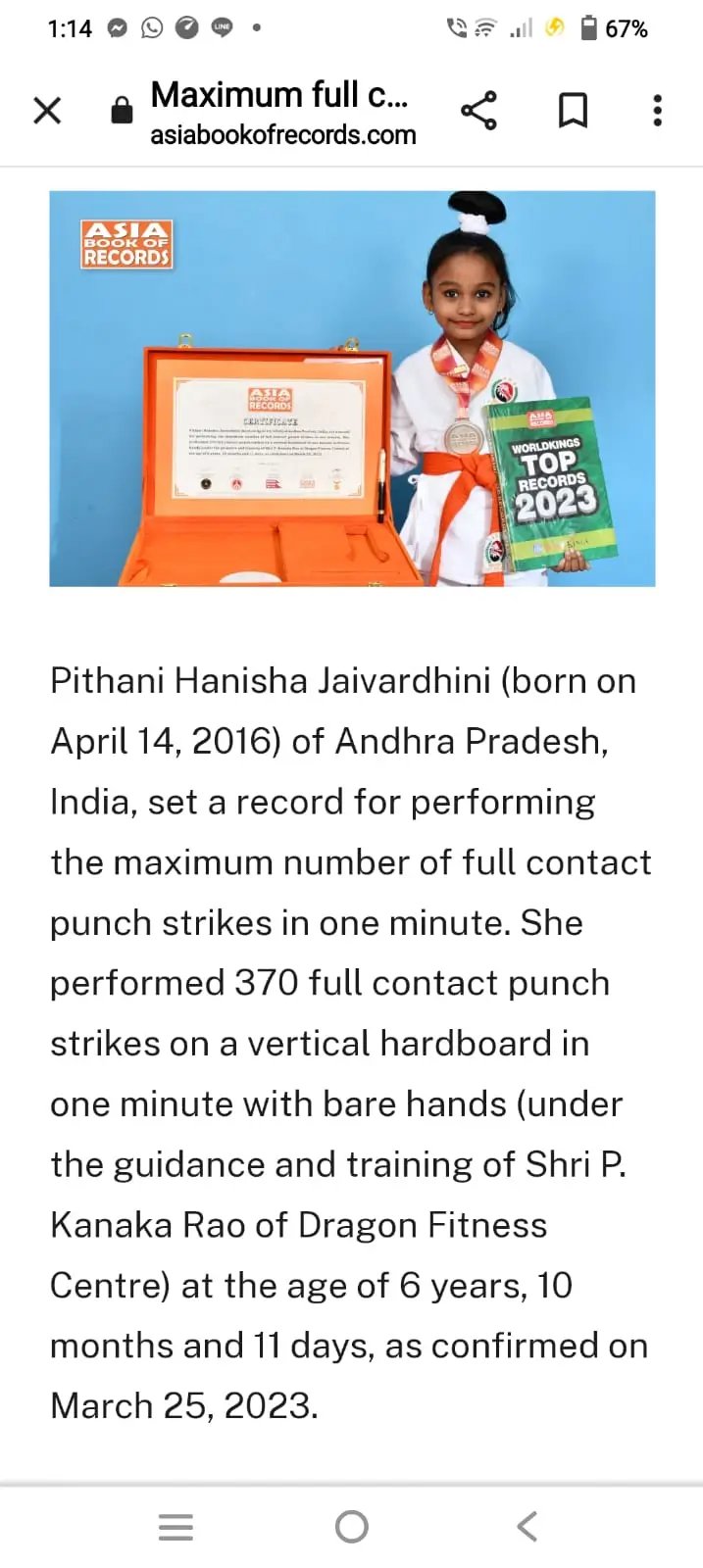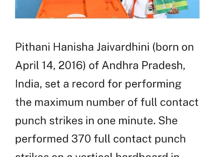 Pithani Hanisha Jaivardhini from Andhra Pradesh achieved an Asia Book of Records title by performing 370 full contact karate punch strikes in one minute on a vertical hardboard with bare hands. She accomplished this remarkable feat at the age of 6 years, 10 months, and 11 days under the expert guidance and training of Shri Pediredla Kanakarao of Dragon Fitness Centre. Her achievement stands as an inspiring example of dedication, discipline, and excellence in martial arts at a young age.