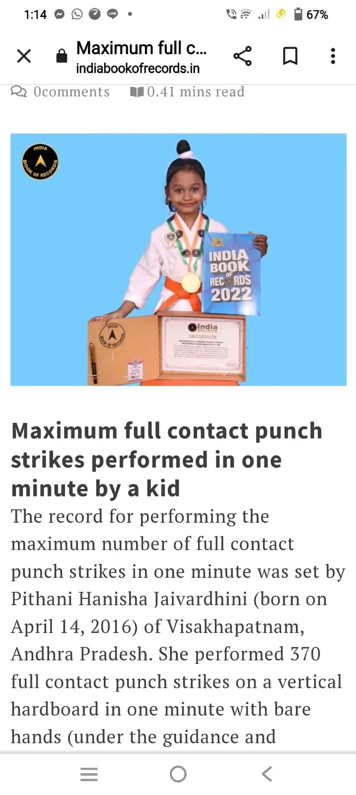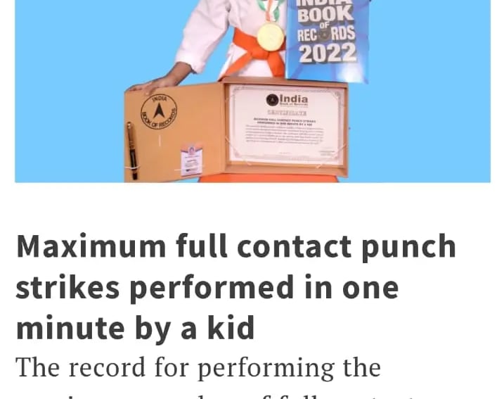 Pithani Hanisha Jaivardhini from Visakhapatnam, Andhra Pradesh, achieved recognition in the India Book of Records for performing the maximum full contact punch strikes in one minute by a child. She successfully completed 370 powerful punches on a vertical hardboard within one minute using bare hands, demonstrating exceptional speed and discipline at a very young age. This remarkable achievement was accomplished under the expert training and guidance of Shri Pediredla Kanakarao of Dragon Fitness Centre, showcasing his dedication to nurturing young martial arts talent.